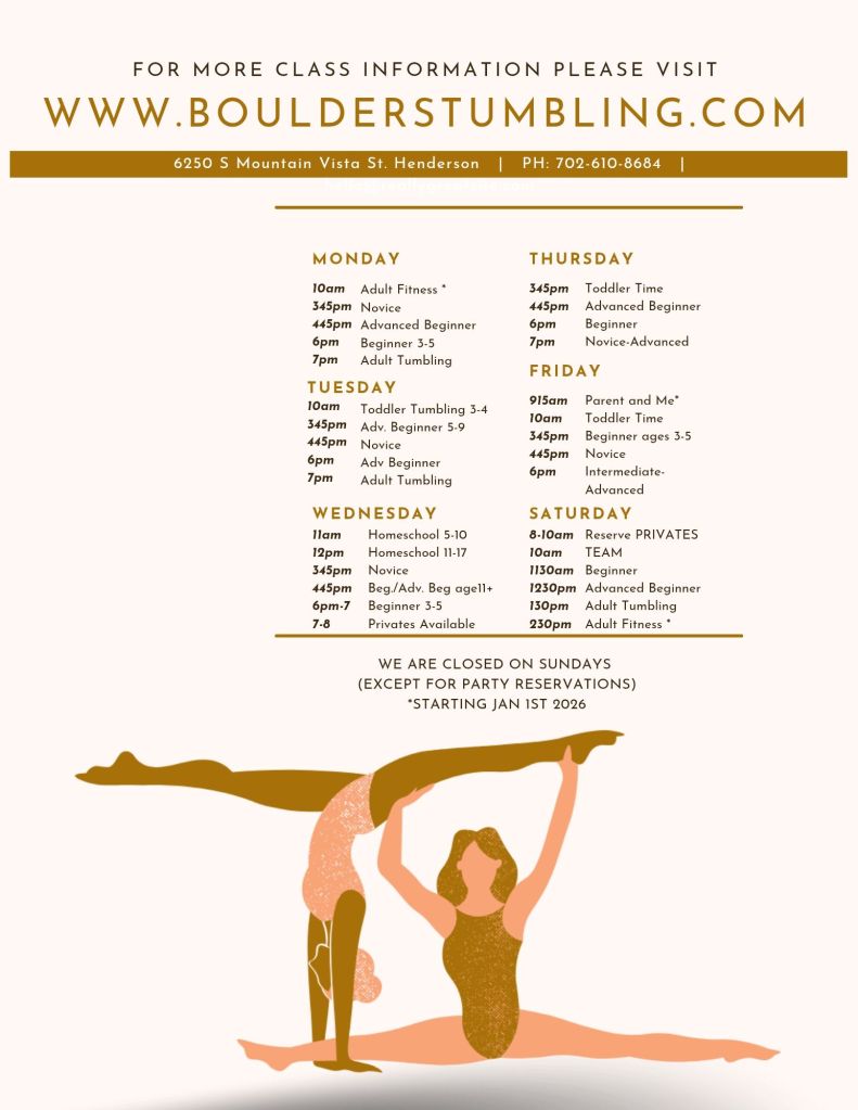 Acro/Cheer/Dance Tumbling– you’ll be placed in a class based off your level of skills. Whatever the athlete needs/wants to learn will be the focus. Power Tumbling style has been adopted by many other sports competitions. Learn the proper footing, hand placements, Neck alignments for skills. Increase your strength and speed with power Tumbling classes.